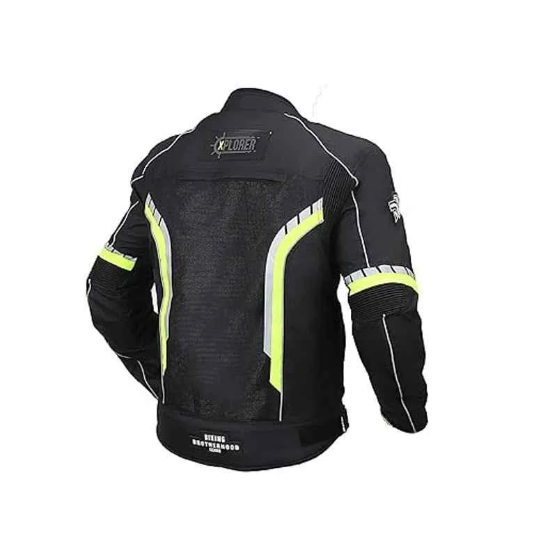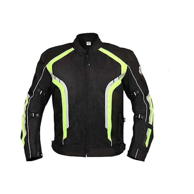 This men’s motorcycle riding jacket is built for riders who demand safety, comfort, and high visibility on the road. Designed with a bold black base enhanced by neon green and white reflective accents, it ensures you stand out both day and night.