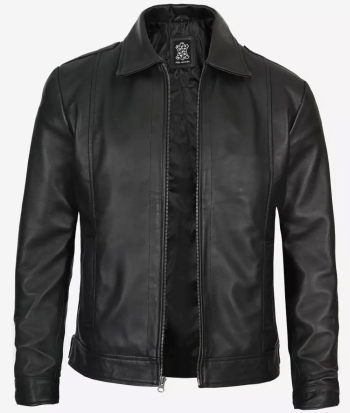 This is a classic and versatile men’s black leather jacket with a clean, timeless design. It features a traditional point or turn-down collar and a full-length front zipper. The jacket has a sleek, polished look with simple, vertical seam details on the front and back, adding a subtle touch of style without being too busy.